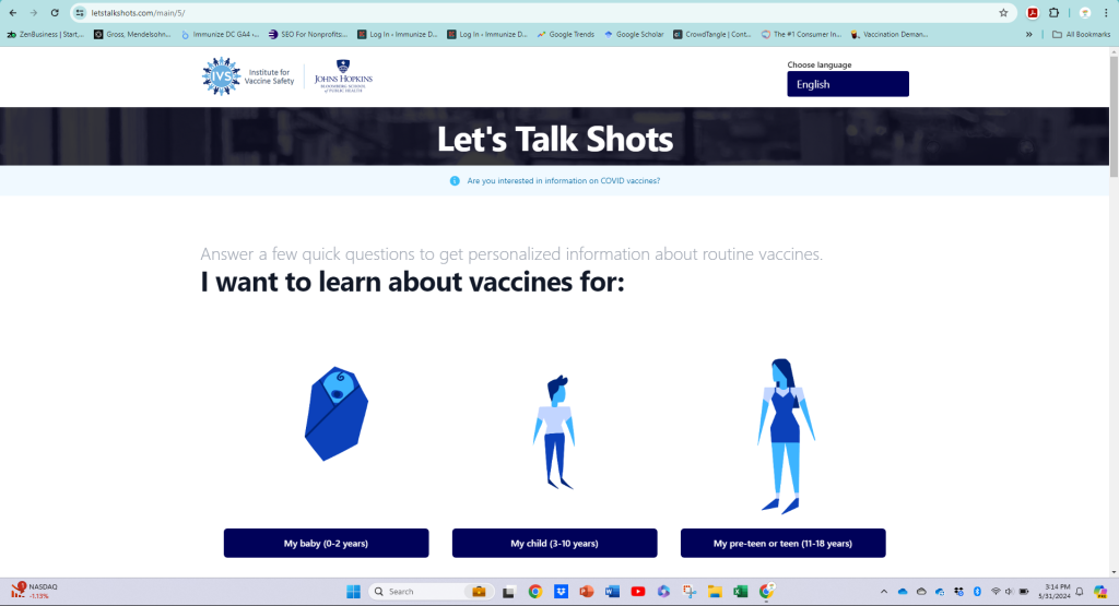 LetsTalkShots is a new tool and website created by The Johns Hopkins Bloomberg School of Public Health’s Institute for Vaccine Safety (IVS), along with its public health partners. It is designed to help people with vaccine decision-making for themselves and their family members. It shares engaging animated content and videos based on a person’s questions or concerns about vaccines. Its partner site, LetsTalkCOVIDVaccines, focuses exclusively on COVID vaccines.